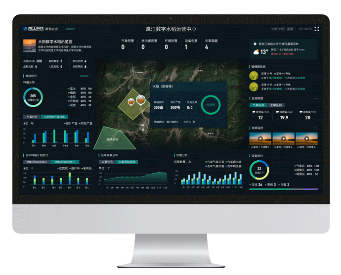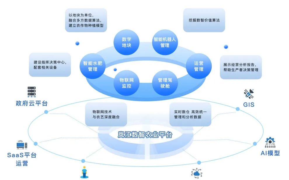 岚江科技同时专注于智慧农业的创新与发展,构建了一套基于农业机器人技术的全产业链数智农业SaaS平台。平台深度融合了云计算、大数据、人工智能、GIS和AIOT等先进技术前沿技术,在基地生产全过程中,对基地种植情况、作物生长环境、农机作业数据、农事信息、设备信息等进行多维度的大数据分析和可视化展现。
